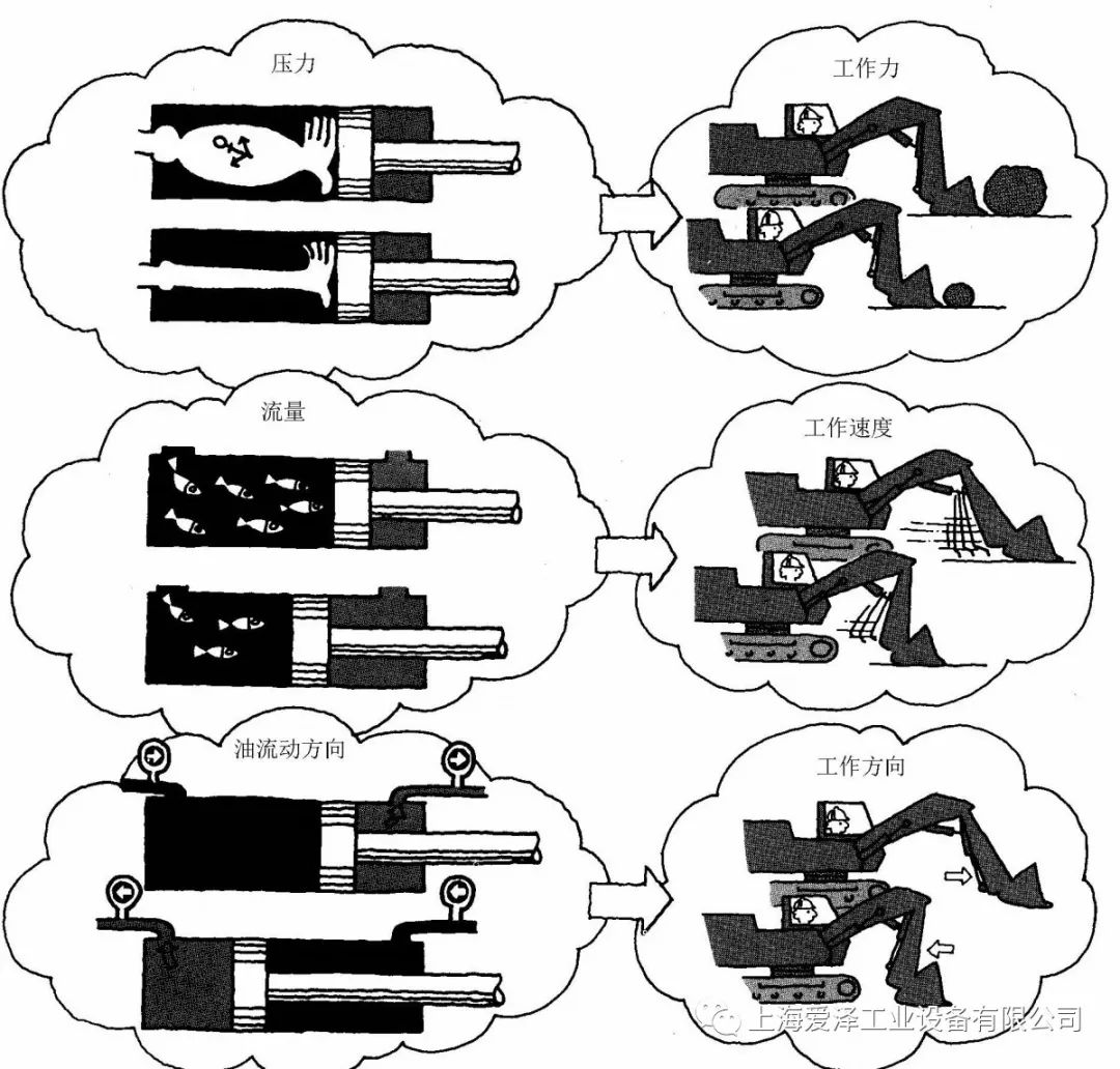 工作力、速度和方向三大條件可以放入下圖的液壓術(shù)語之中。