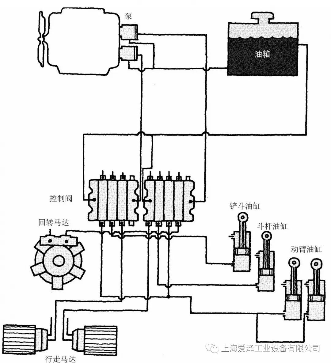 在液壓挖掘機中,發(fā)動機產(chǎn)生第一機械能,第一機械能帶動泵運轉(zhuǎn)。泵使油流出并進入系統(tǒng)。油到達執(zhí)行元件時,重新在執(zhí)行元件的運動過程中轉(zhuǎn)變成機械能。挖掘機動臂因此得到提升或下降,鏟斗得以運動等等。