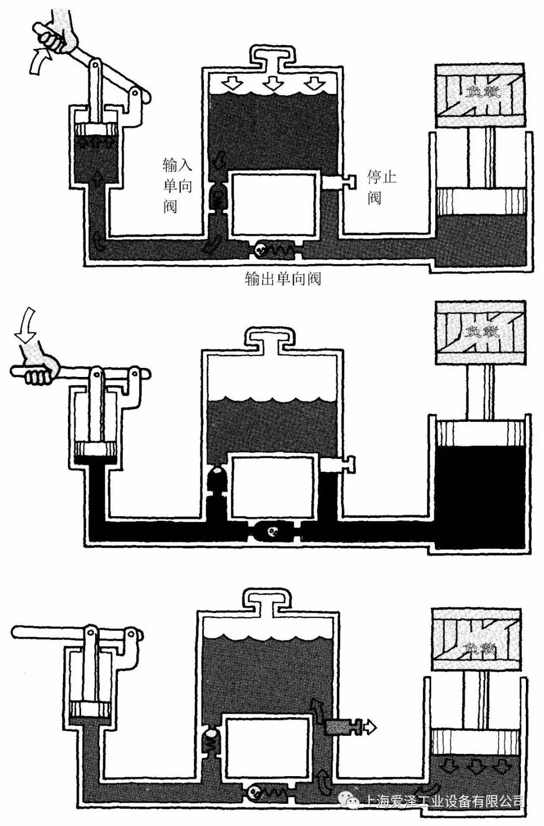這里你看到的是一臺液壓千斤頂。把力作用于杠桿時,手動泵使油進入油缸。油壓作用在活塞上向上推動,并提升負載。液壓千斤頂很像帕斯卡液壓杠桿。這里的油箱加了油。增加了單向閥,使油保持在油箱中,使油缸在泵的行程轉(zhuǎn)換中位置不動。上圖中,負載壓力使輸出單向閥處于關(guān)閉狀態(tài)。泵手柄向上拉動時,輸入單向閥打開,允許油箱中的油注入泵室。接著,向下推動泵手柄。油壓關(guān)閉輸入單向閥,而打開輸出單向閥。這一運動過程中,有較多的油進入油缸,推動活塞向上運動。下圖顯示的是打開停止閥,它連接油箱和油缸,這樣油可以流回油箱,使活塞降下。