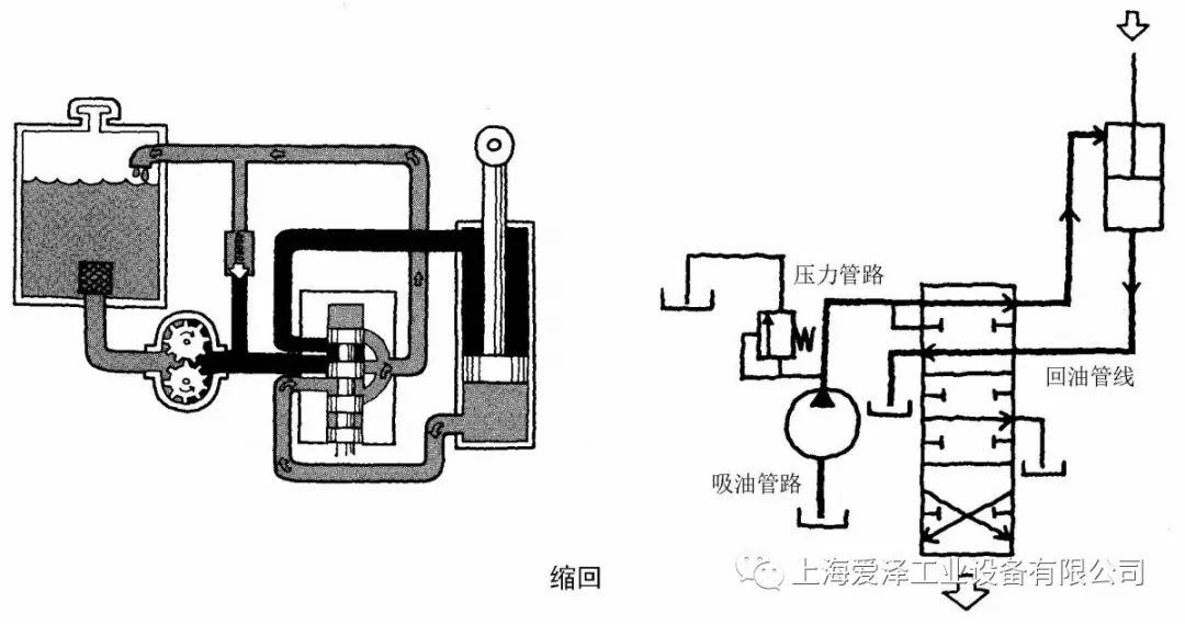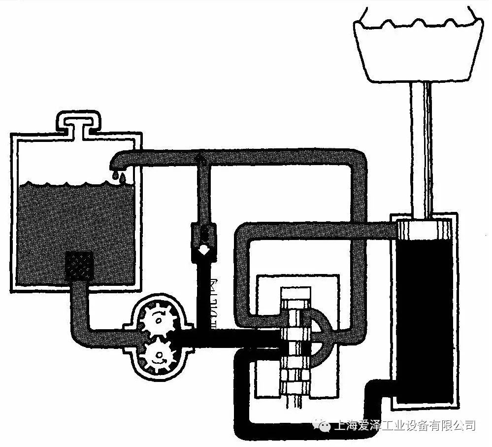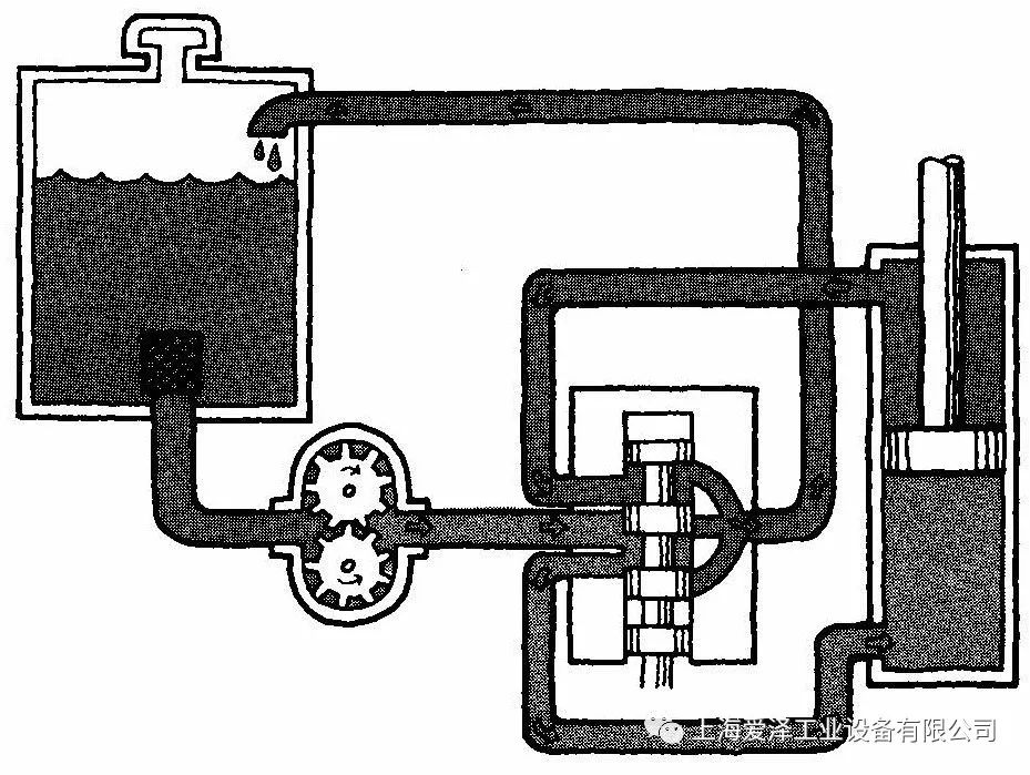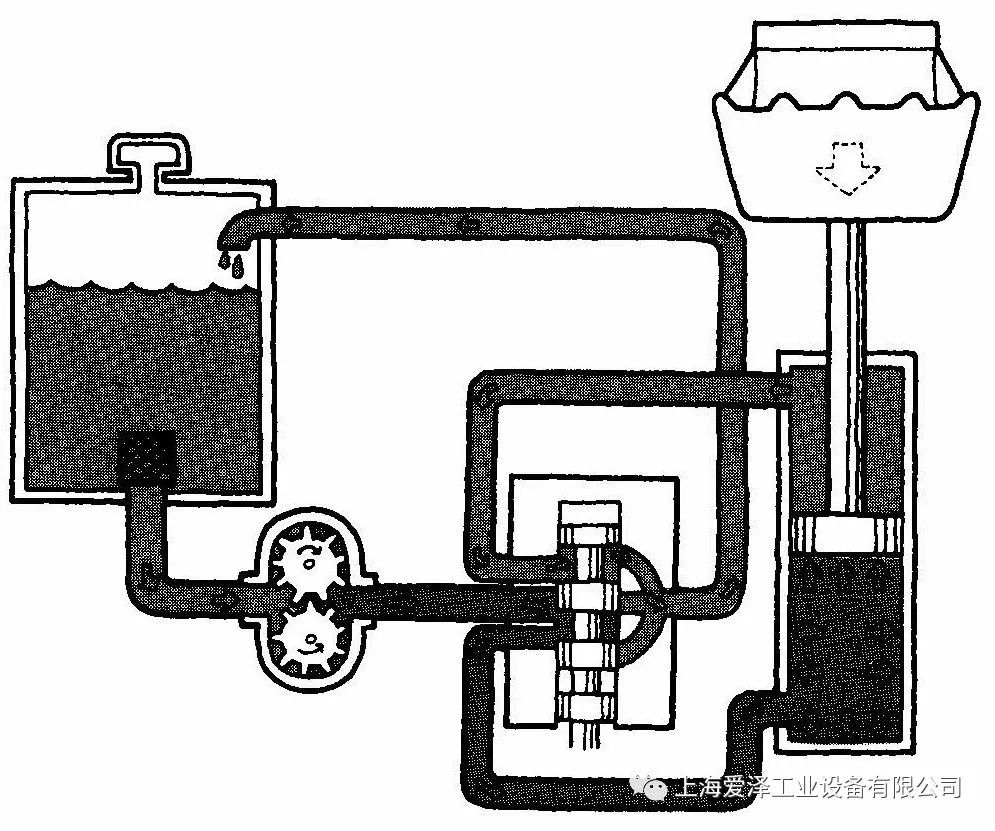 4.泵與控制閥間管道相連接。泵出的油流至閥。閥的任務(wù)是使油流向油缸或油箱。
