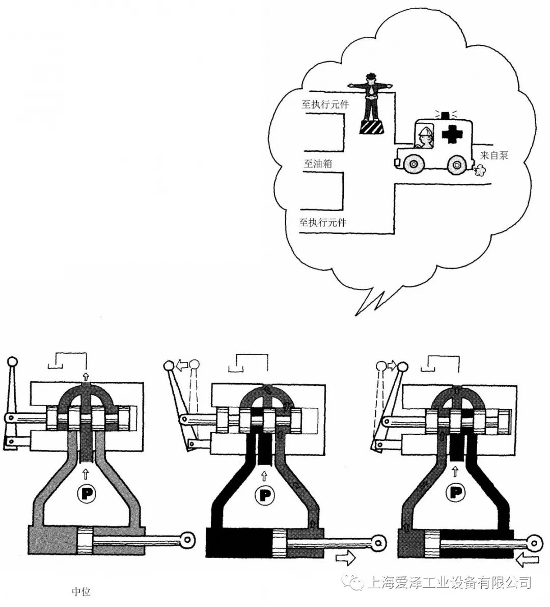 本插圖中的滑閥顯示三種位置,中位、左位和右位。我們稱之為4通閥,因為它擁有4條可能的通道,這些通道通向油缸兩端,以及油箱和泵。