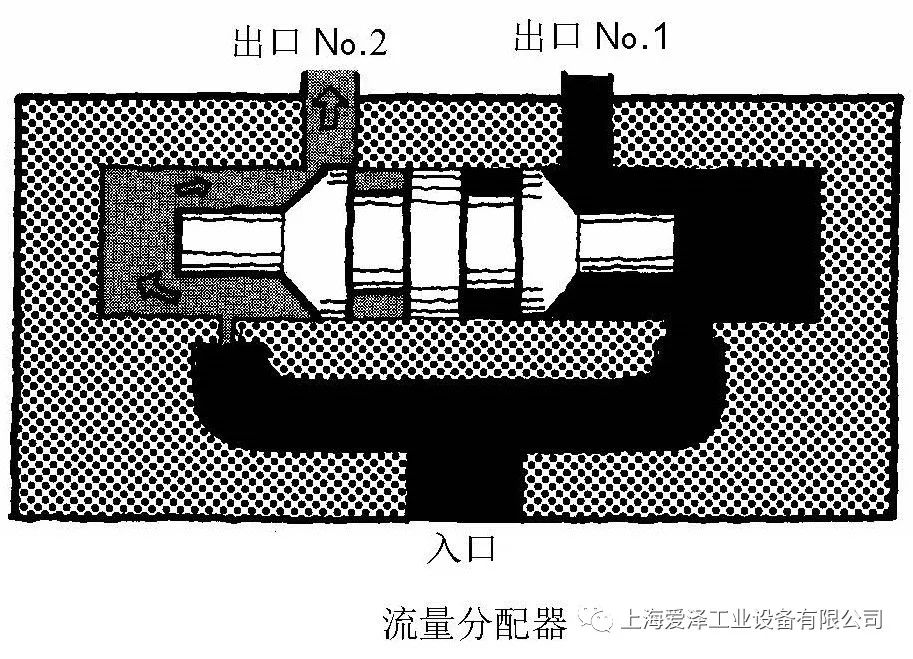 此閥門的用途是分配單一來源的油流。下圖流量分配器將兩出口的流量分成大約75:25。因為No.1入口大于No.2入口,使得這種分配成為可能。