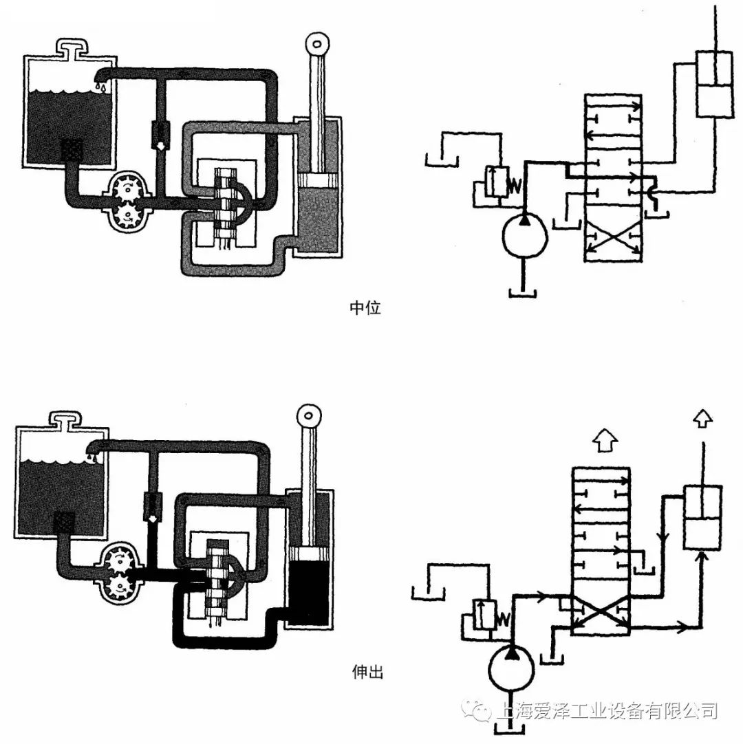 把閥門向左移動時,油從泵流向油缸左側(cè),油缸右側(cè)的油流向油箱。結(jié)果,活塞向右移動。如果將欄桿向右移動,動作相反,活塞向左移動。在中間位置,中位的油流向油箱。油缸兩端的通道關(guān)閉。