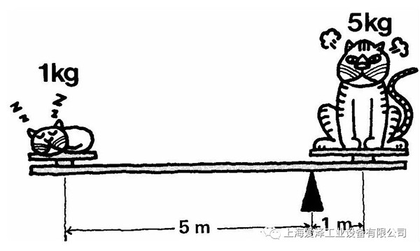 機(jī)械杠桿可以利用以下插圖中的機(jī)械杠桿例子說明相同的情況。1公斤的貓坐在距杠桿支點(diǎn)5米的位置,它與坐在距杠桿支點(diǎn)一米位置的5公斤的貓可以使杠桿平衡,就像液壓杠桿中的平衡重量一樣。