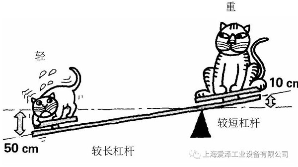 記住,在機(jī)械杠桿中,施加相等的力時,較輕的重量需要更長的杠桿。要使5公斤的貓?zhí)岣?0厘米,1公斤的貓必須向杠桿下方移動50厘米。