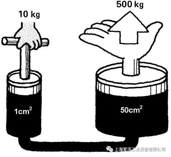 例如,假定系統(tǒng)另一端大活塞的表面面積為50平方厘米,小活塞的面積為1平方厘米,當(dāng)我們將10公斤的力作用于較小的活塞時,根據(jù)帕斯卡定律,它將產(chǎn)生10公斤/平方厘米的壓力作用于大活塞的每一個部分,因此,大活塞接受總共為500公斤的力。我們以這種方式利用壓力傳遞能量,并使之為我們工作。