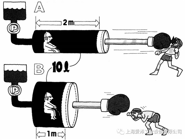 這里油缸A為兩米長,容量10升,油缸B只有1米長,但是容量也是10升。如果我們每分鐘將10升液體泵入每一個油缸,兩活塞將在一分鐘內(nèi)完成它們的全部行程;在這種情況下,油缸A中的活塞運(yùn)動速度快是油缸B的兩倍。這是因?yàn)樵谙嗤瑫r間內(nèi)它有兩倍于B油缸的距離移動。