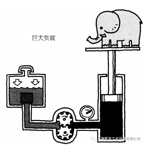 大部分壓力來自負(fù)載本身。以下插圖中,泵每時每刻供應(yīng)著油。泵出的油尋找使它得以通過軟管的最小阻力通道,從而作用于油缸。負(fù)載重量產(chǎn)生壓力,壓力的量則取決于負(fù)載大小。