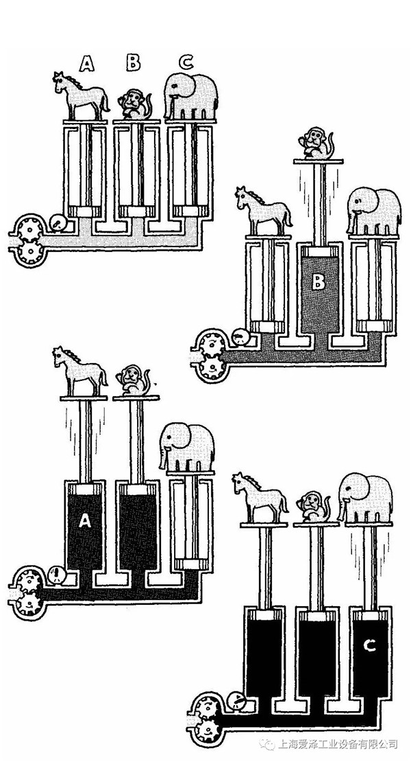 如果我們將三個不同負(fù)載以平行方式與下圖所示的同一液壓系統(tǒng)連接,油將會找到最小阻力通道,因?yàn)橛透譈需要的壓力最低,也就是說最輕負(fù)載將首先得到提升,提升最輕負(fù)載時,壓力將上升到足夠大小以提升下一次輕負(fù)載;油缸A到達(dá)其行程終端時,壓力上升以提升最重負(fù)載。因此油缸C將在最后被提升。
