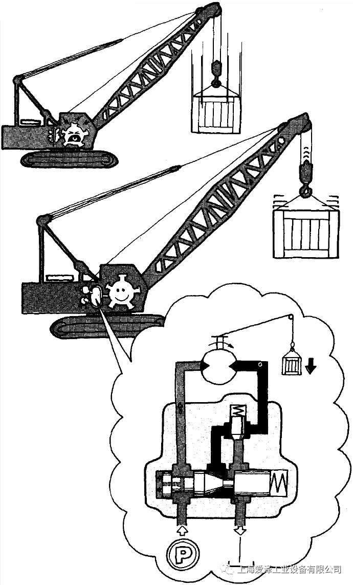 任何由于負(fù)載慣性引起的馬達(dá)超速運(yùn)轉(zhuǎn)都會(huì)在泵出油管路中引起瞬時(shí)壓力下降,閥芯會(huì)立即關(guān)閉馬達(dá)出油管路,直至在泵出油管路中形成壓力。