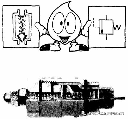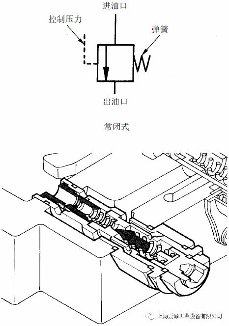 圖中顯示的是像溢流閥一樣的常閉閥,從中還可看到從油口至控制壓力管路的箭頭偏差。