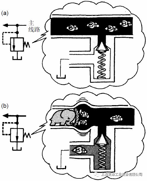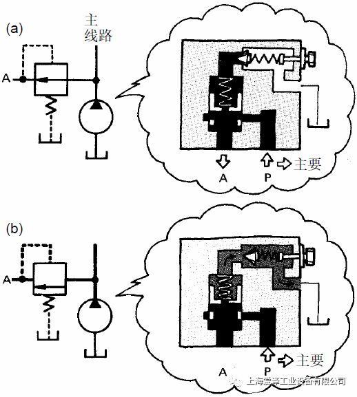(b)主油路中產(chǎn)生壓力時(shí),相同的壓力通過控制油路作用于閥芯,達(dá)到設(shè)定壓力時(shí),閥芯打開,至油箱的通道形成,以釋放主油路的壓力。