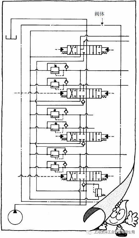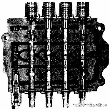 日立公司四聯(lián)換向閥組符號(hào)類似于四聯(lián)閥符號(hào),但是它加入了油口和油道,表示旁通油路。