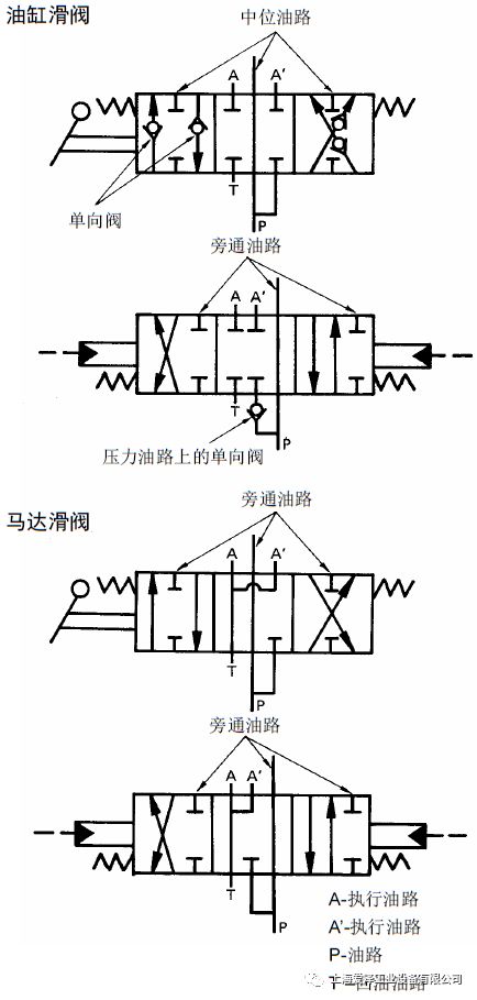 兩端的矩形表示,當(dāng)滑閥被切換到該位置時(shí)所對(duì)應(yīng)的液壓油流動(dòng)方向。