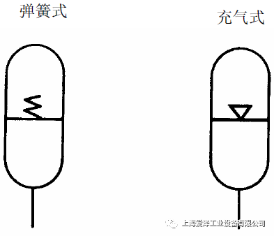 蓄油器為橢園形,內(nèi)部可加入符號(hào)表示彈簧式或充氣式。
