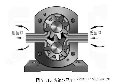 齒輪泵具有一對互相嚙合的齒輪,通常用作供油系統(tǒng)的動力泵,如圖所示,齒輪(主動輪)固定在主動軸上,軸的一端伸出殼外由原動機(jī)驅(qū)動,另一個齒輪(從動輪)裝在另一個軸上,齒輪旋轉(zhuǎn)時,液體沿吸油管進(jìn)入到吸入空間,沿上下殼壁被兩個齒輪分別擠壓到排出空間匯合(齒與齒嚙合前),然后進(jìn)入壓油管排出。