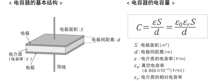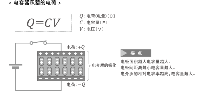 電容器的基本結構是間隔對置的2個電極(金屬板)。施加直流電壓(V)到2個電極上,電子瞬間聚集到其中一個電極上,該電極帶負電,另一個電極則處于電子不足的狀態(tài),帶正電。該狀態(tài)在撤去直流電壓后依舊存在。即,在2個電極之間蓄積了電荷(Q)。在電極間插入電介質(陶瓷、塑料薄膜等),通過電介質的極化,蓄積的電荷增加。表示電容器蓄積多少電荷的指標叫做電容量(C)(簡稱容量)。