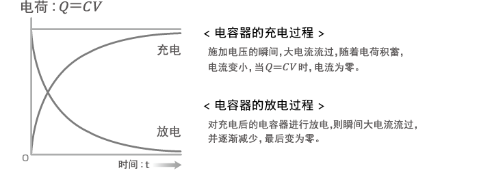 電容器也被稱為蓄電器,顧名思義,就是通過采用大面積的電極構造以及高電容率的電介質,從而能夠蓄積大量電荷。 接通電源施加直流電壓,則電流瞬間流向導線,對電容器進行充電;當電極間的電位差與電源電壓相等,則電流不再流動,充電結束。充放電過程如下圖所示。