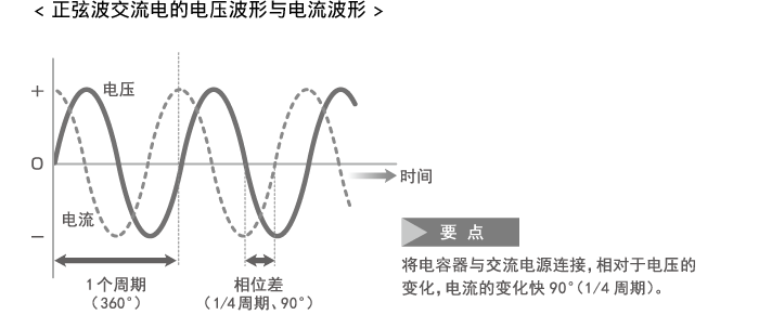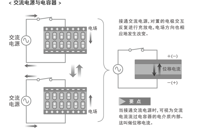 電容器的電極被電介質阻隔,施加直流電壓后,在充電過程中電流瞬間流過導線,但不會流到電介質的內部。即,電容器具有阻斷直流的性質。連接交流電源,則電極板周期性地反復進行充電與放電,電場方向也會相應地發(fā)生改變。雖然不是在絕緣體內部出現電子移動,但實際上與流過交流電流相同,因此可視為電容器使交流電流通過。相對于通常的電流(傳導電流),我們將該電流稱為位移電流。