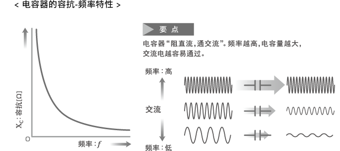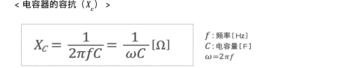 "阻直流,通交流"是電容器的基本性質。但并非所有交流電都一樣通過,通過的阻礙由交流電的頻率與電容器的電容量決定。該交流電通過阻礙叫做容抗(XC)。是電容器對交流電的阻抗,單位是歐姆[?]。電容器的容抗(XC)以如下公式表示。
