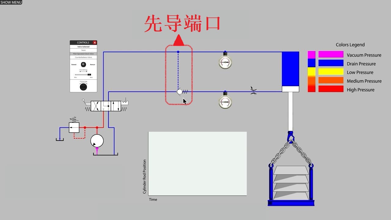 釋放手柄,在方向閥上向我們顯示先導式單向閥確實保持負載